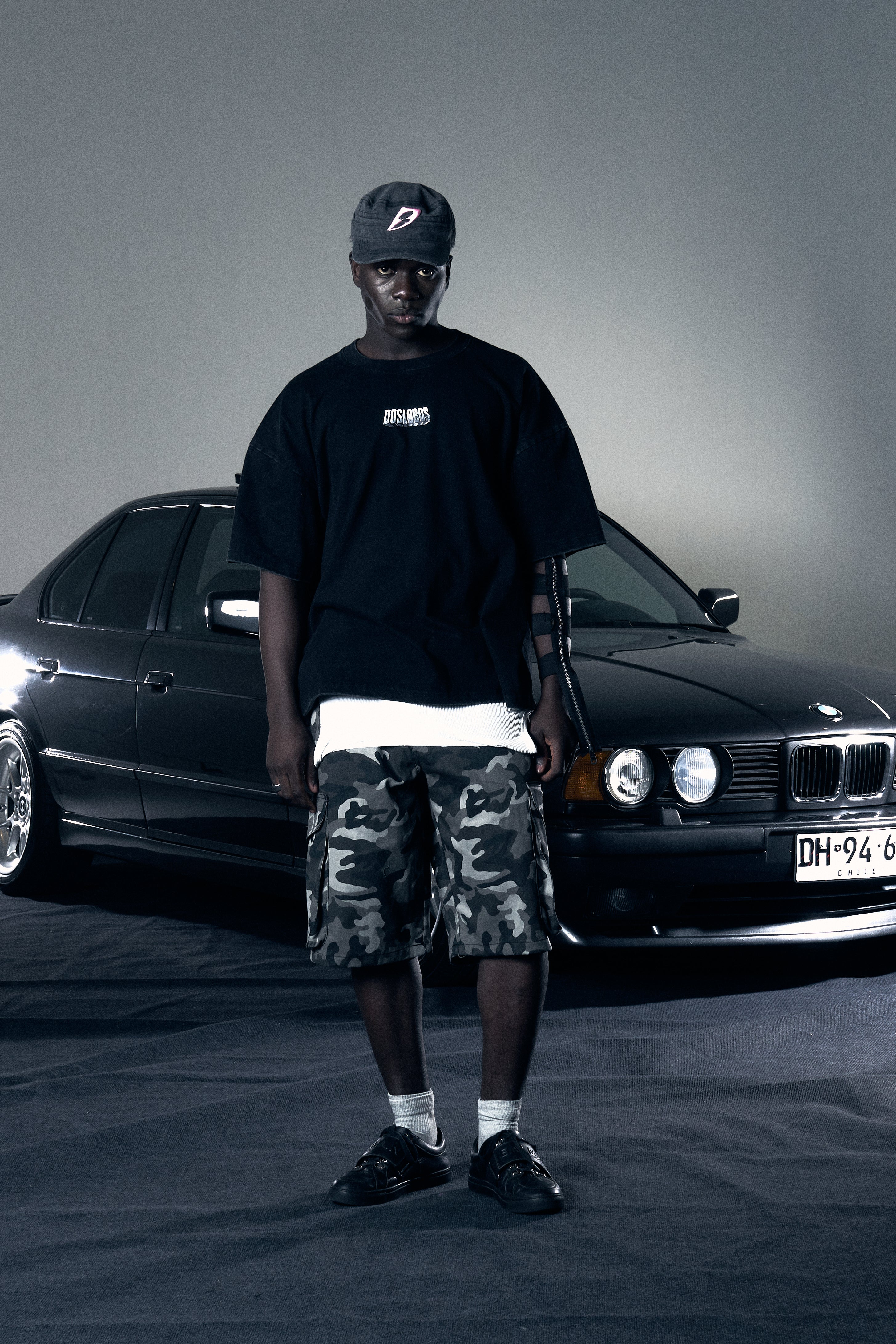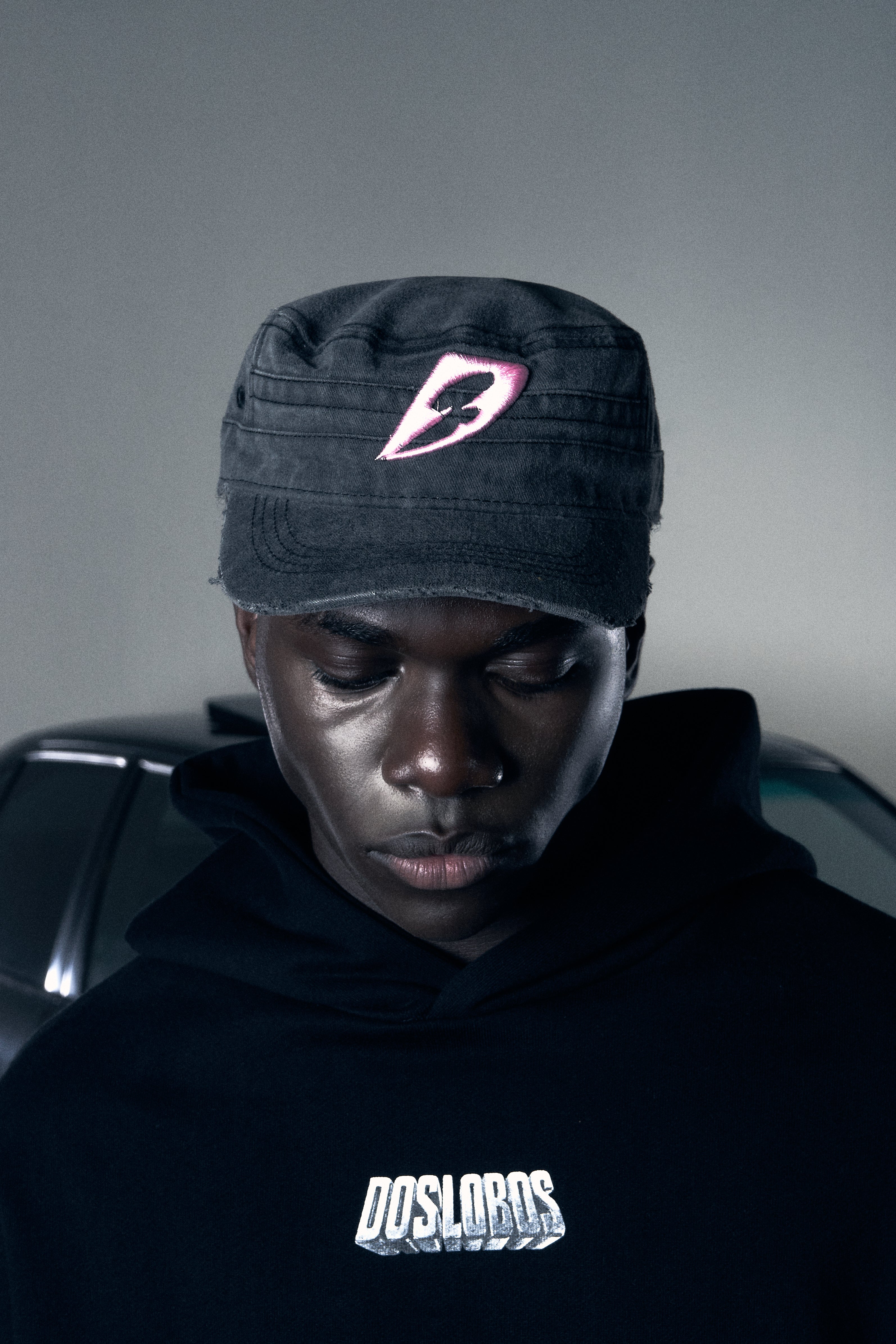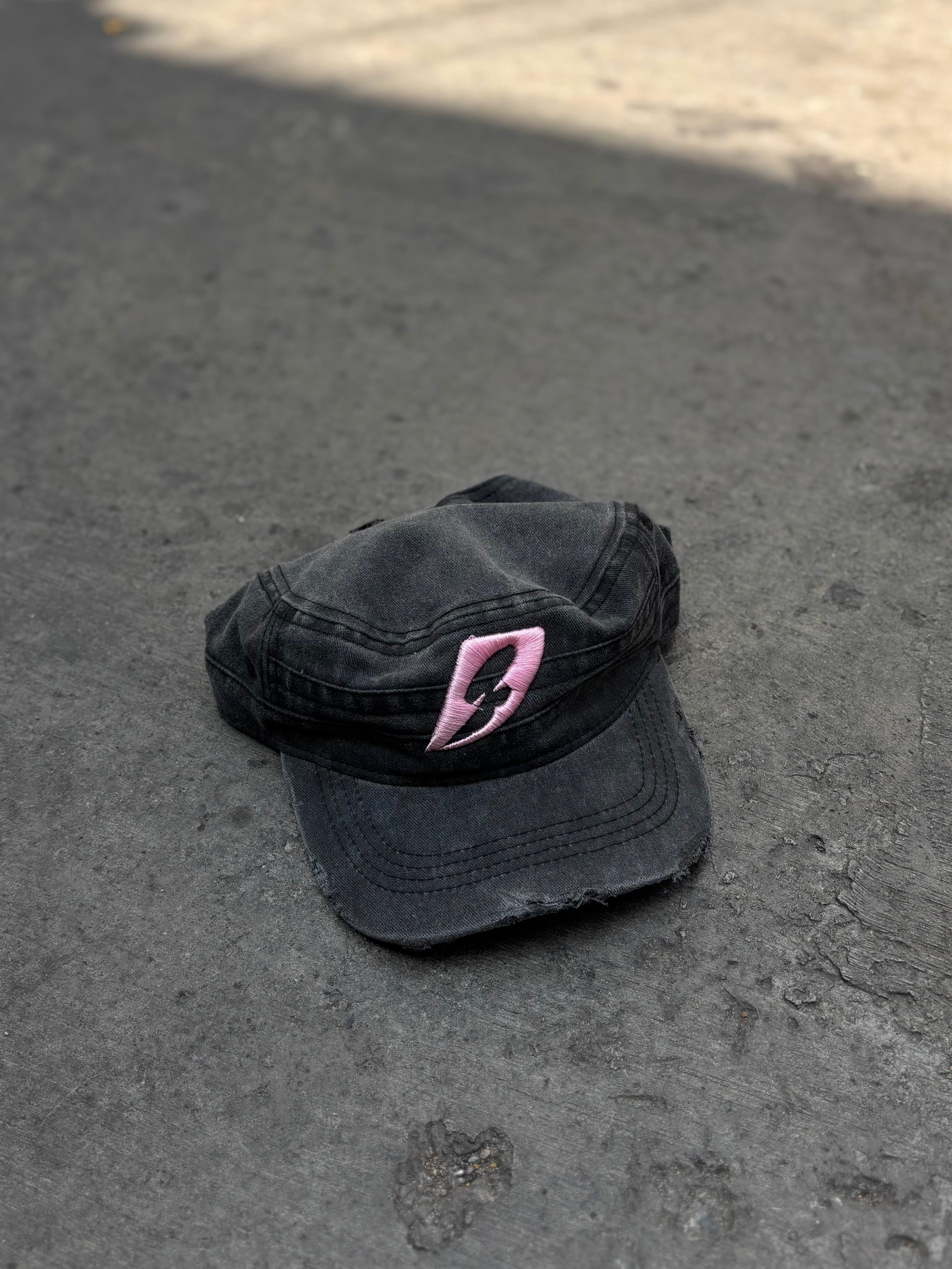 Gorra estilo militar / Visera plana / Copa blanca / Bordado rosa en delantero y trasero / Ajustable / Detalles destroyed / Tela efecto desgastado