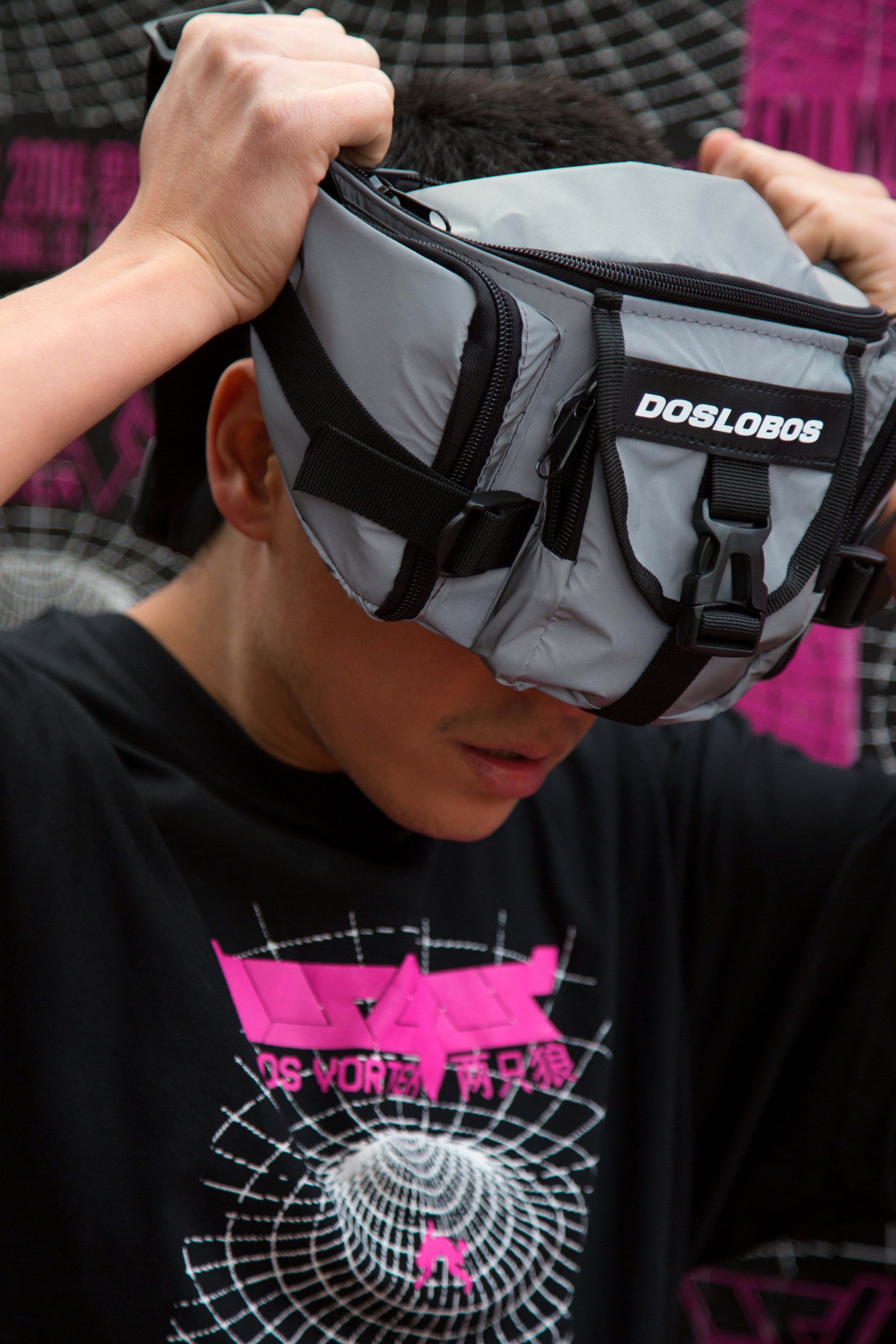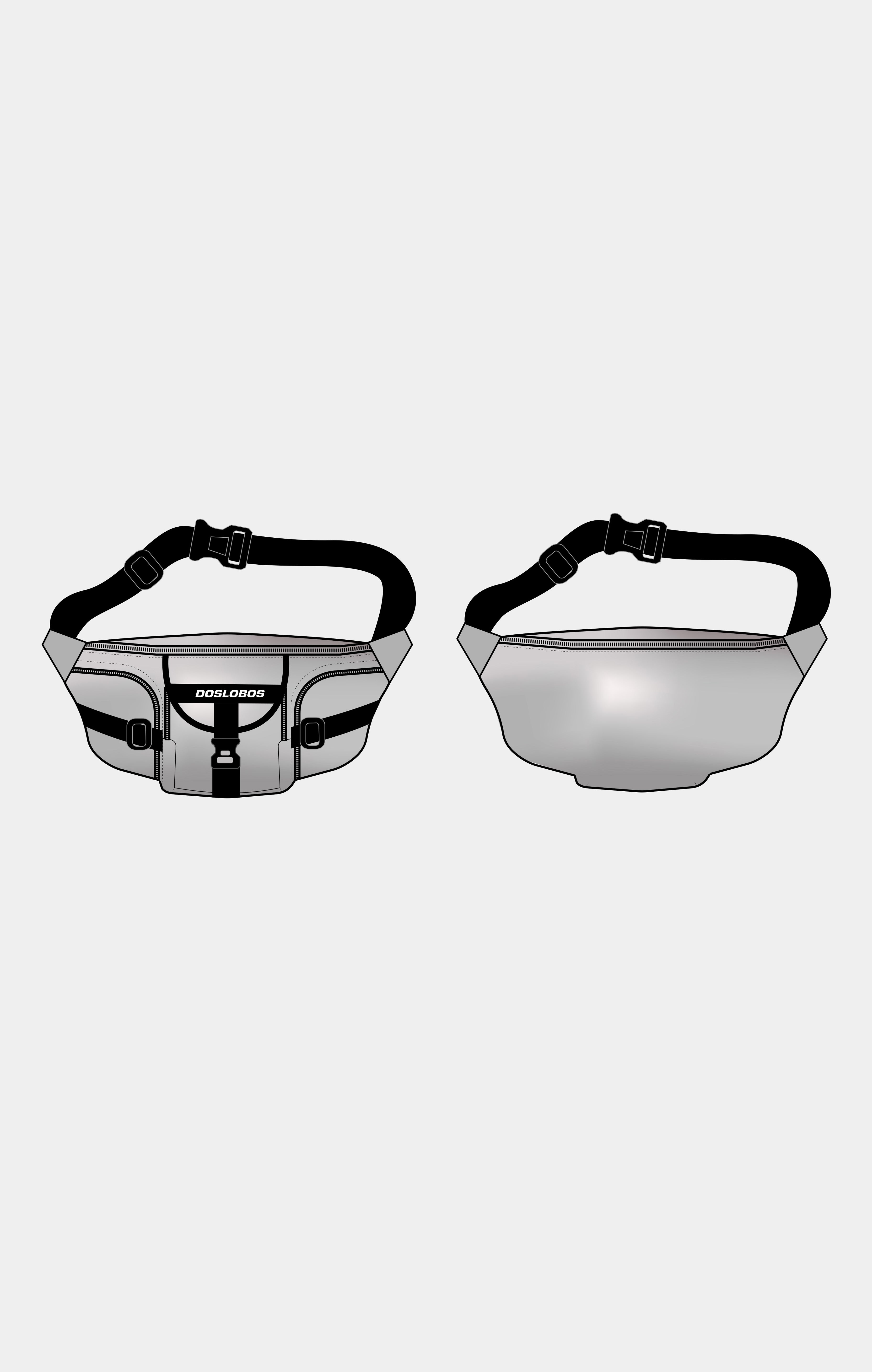 Banano unisex / 4 bolsillos exteriores / 1 bolsillo interior / Pasadores negros / Borche delantero tornasol / Cierres YKK / Correa ajustable tejida gris con negro / Etiqueta como negra con logo blanco