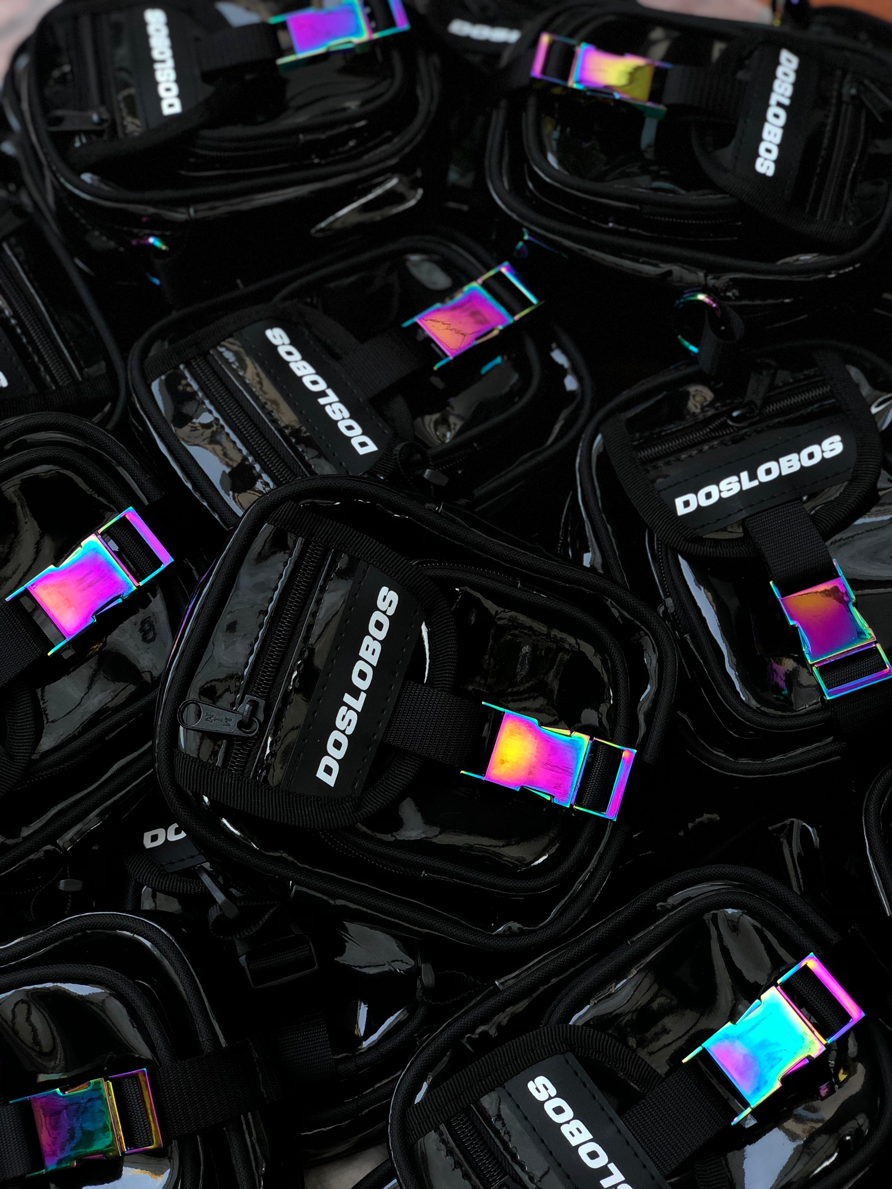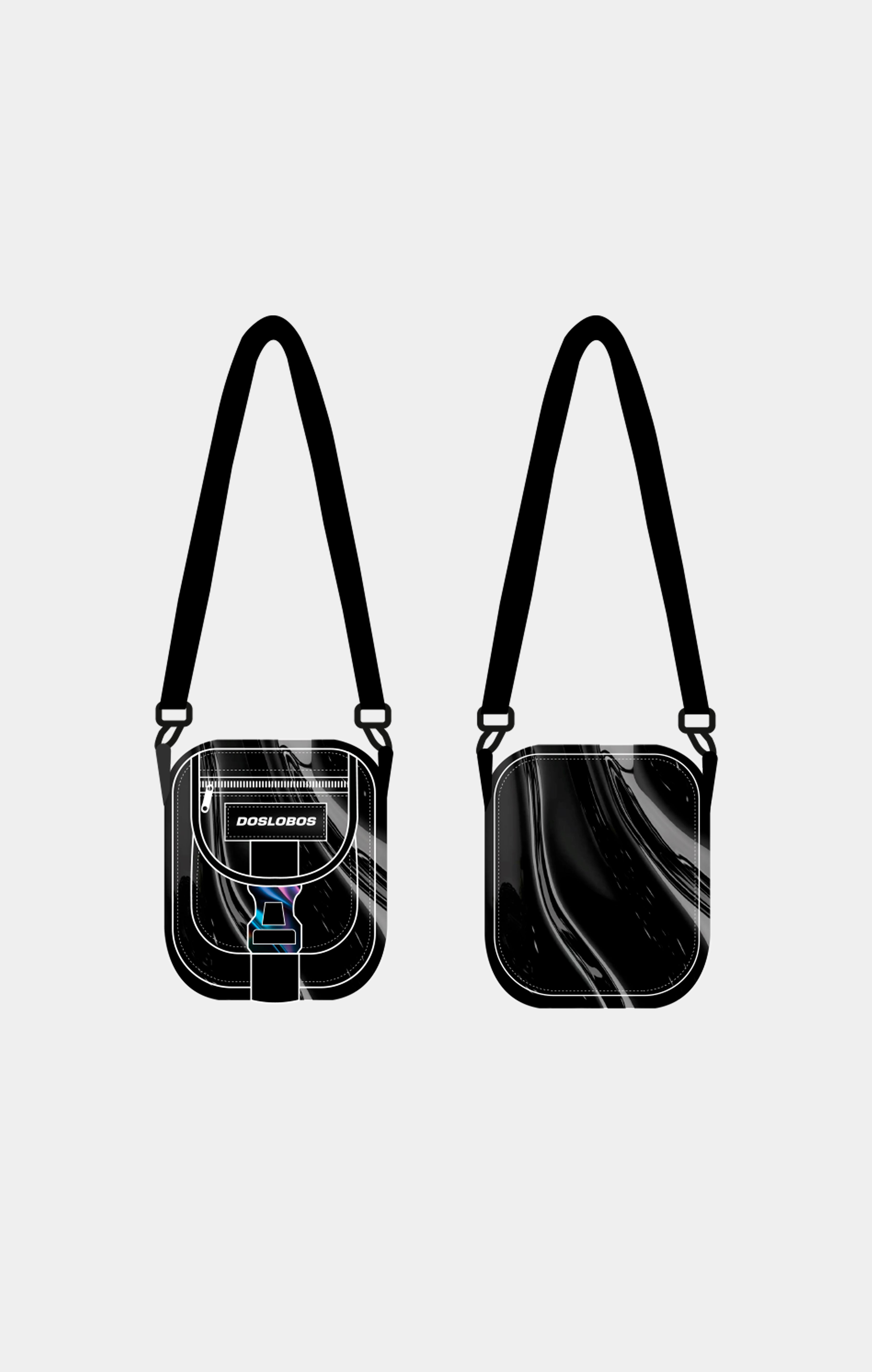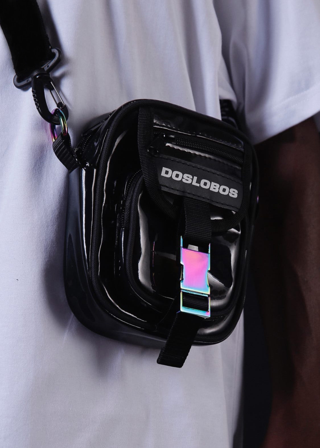 Bolso de hombro unisex / 2 bolsillos exteriores / 1 bolsillo interior / Mosquetones negros / Broche Tip-top tornasol / Correa ajustable bordada gris con negro / Etiqueta goma negra logo blanco